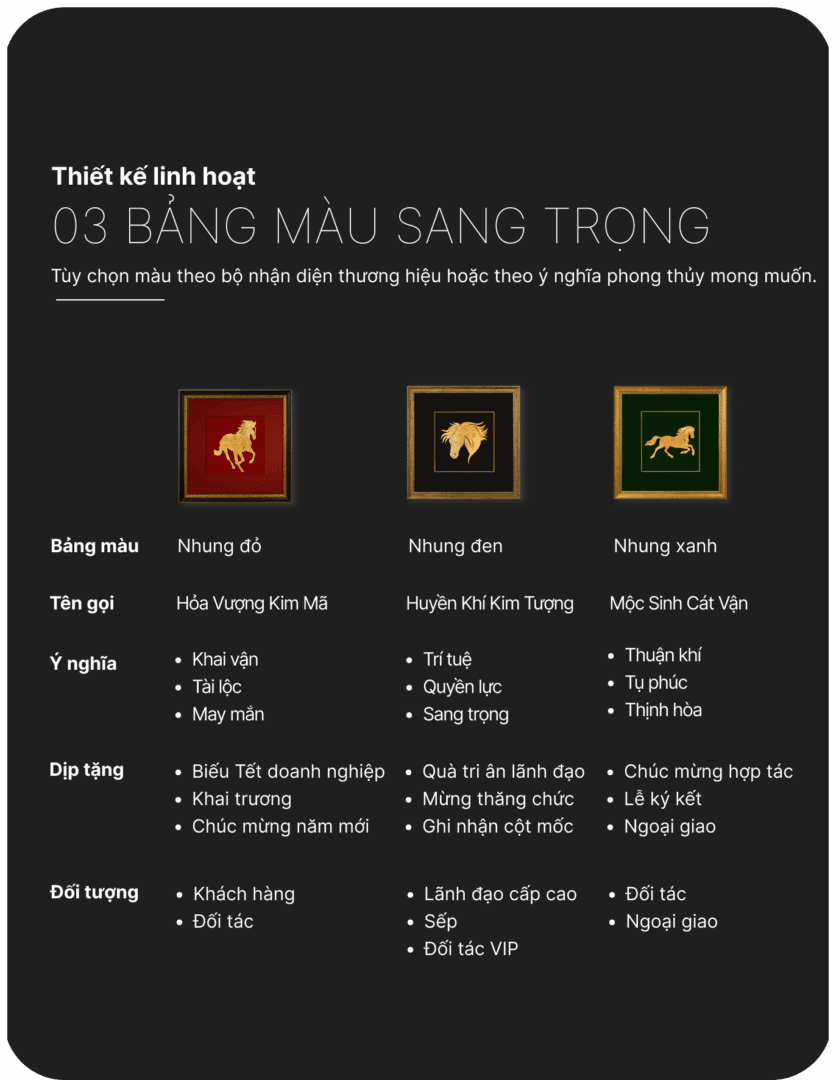 Người tặng có thể chọn từng bức, hoặc ghép thành Song Mã – Tứ Mã – Lục Mã – Bát Mã – Cửu Mã theo câu chuyện và ý nghĩa phong thuỷ riêng.