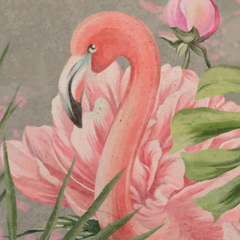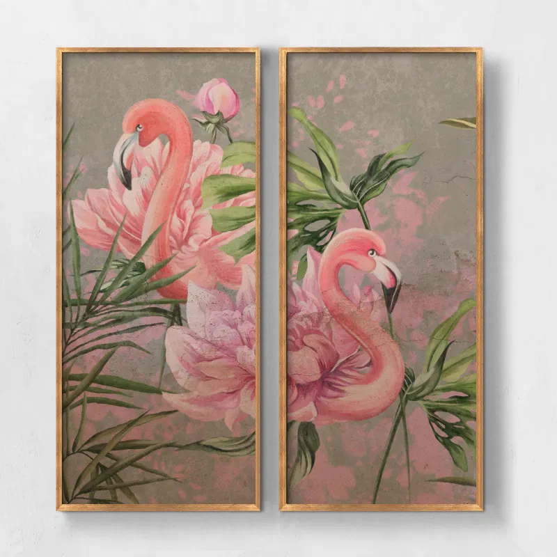 Tranh Indochine hồng hạc Flamingo Waltz gợi hình ảnh hai chú hồng hạc uyển chuyển giữa khung cảnh hoa lá phương Đông. Sắc hồng tươi kết hợp nền xám trung tính tạo nên sự cân bằng tinh tế giữa nghệ thuật cổ điển và phong cách hiện đại.