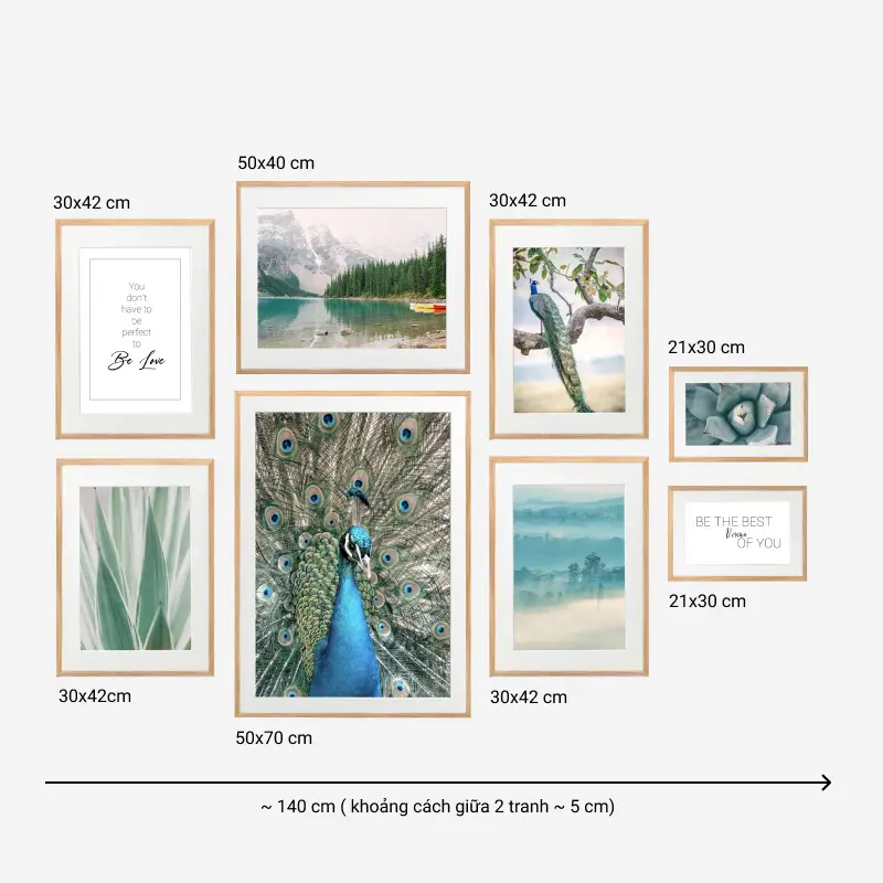 Trọn bộ tranh gồm: 21×30 cm (2 tranh) | 30×42 cm (2 tranh) | 40×50 cm (1 tranh) | 50×70 cm (1 tranh)