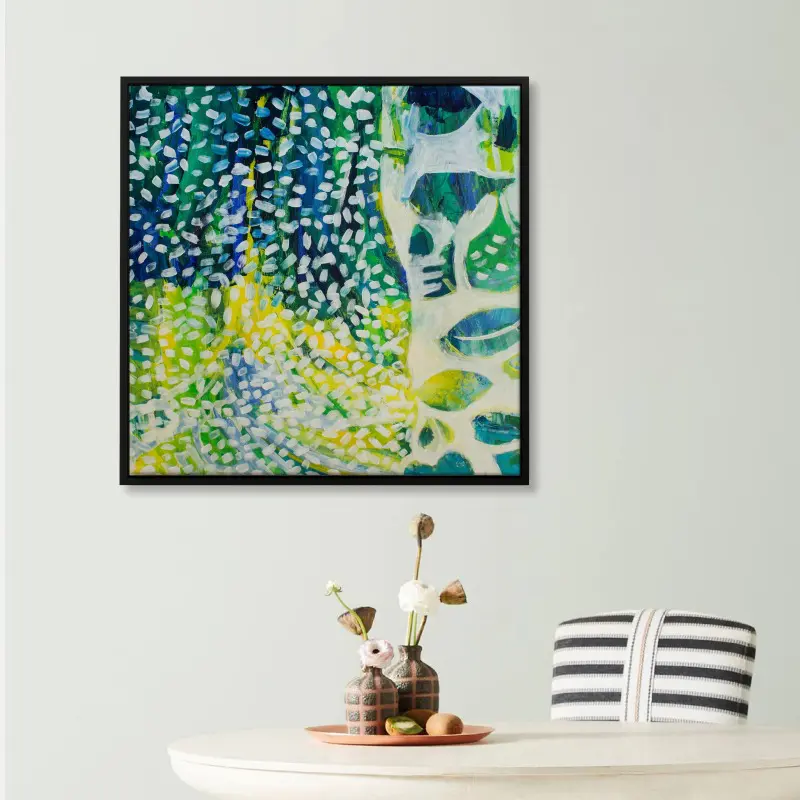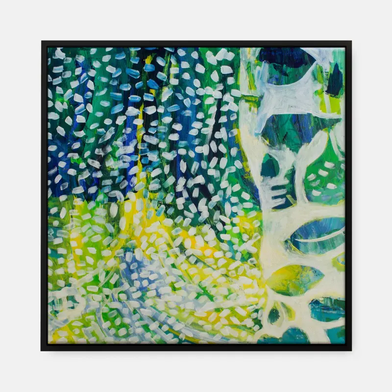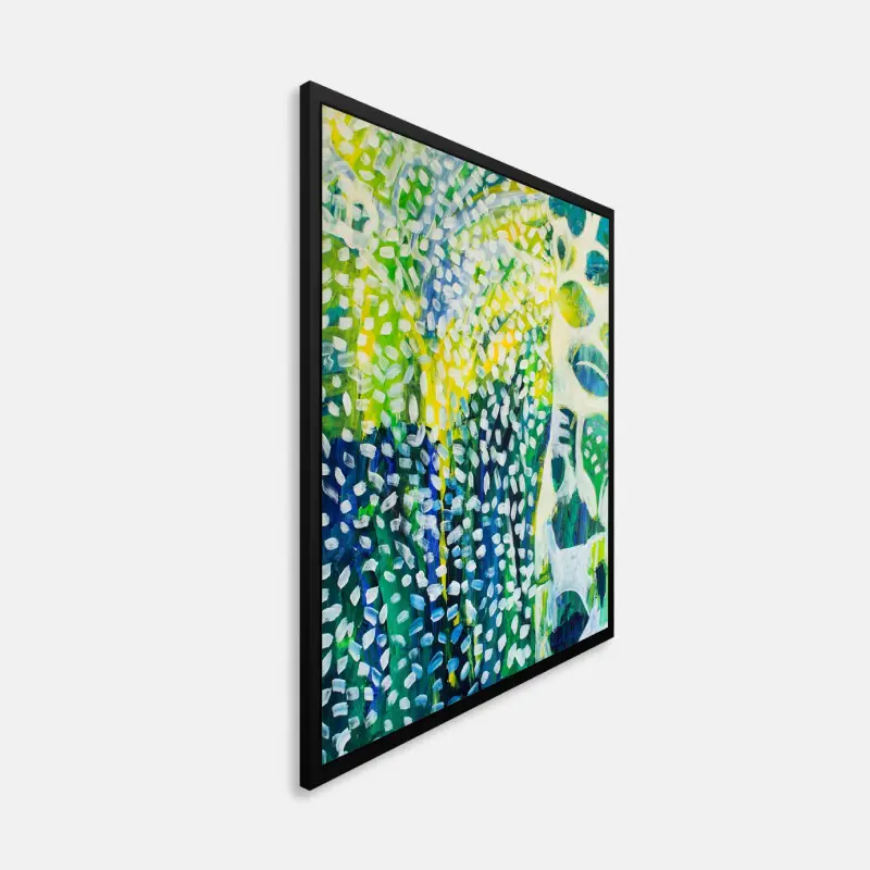 Tranh canvas có khung treo tường Sắc xanh không có bố cục nhất định. Không cần những đường nét phức tạp, chỉ với những chấm tròn ngẫu nhiên, thể hiện qua các tông màu khác nhau đan xen cũng đã đủ tạo nên sự đặc biệt cho tác phẩm.