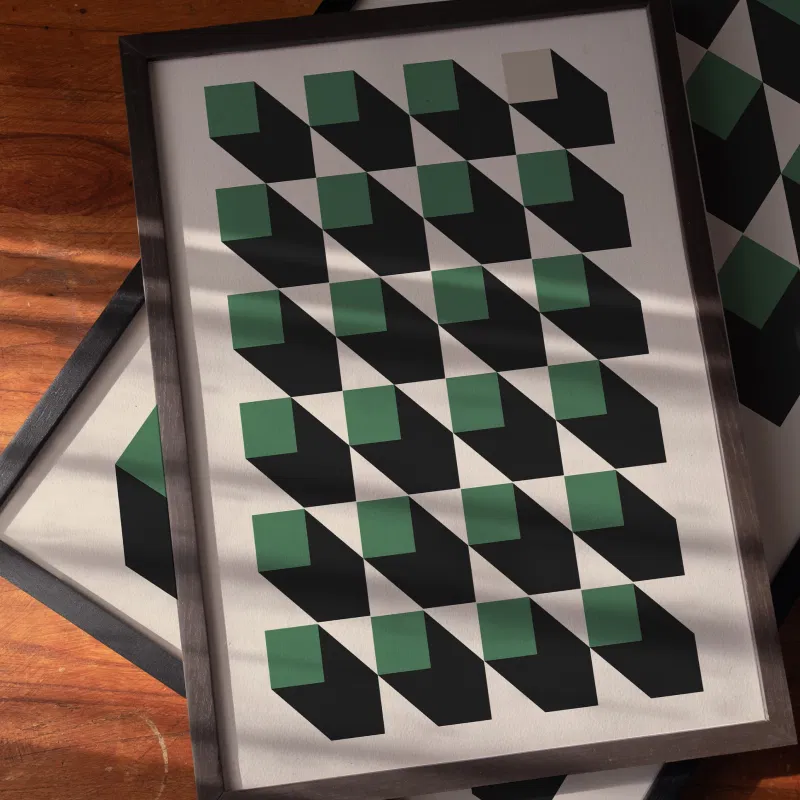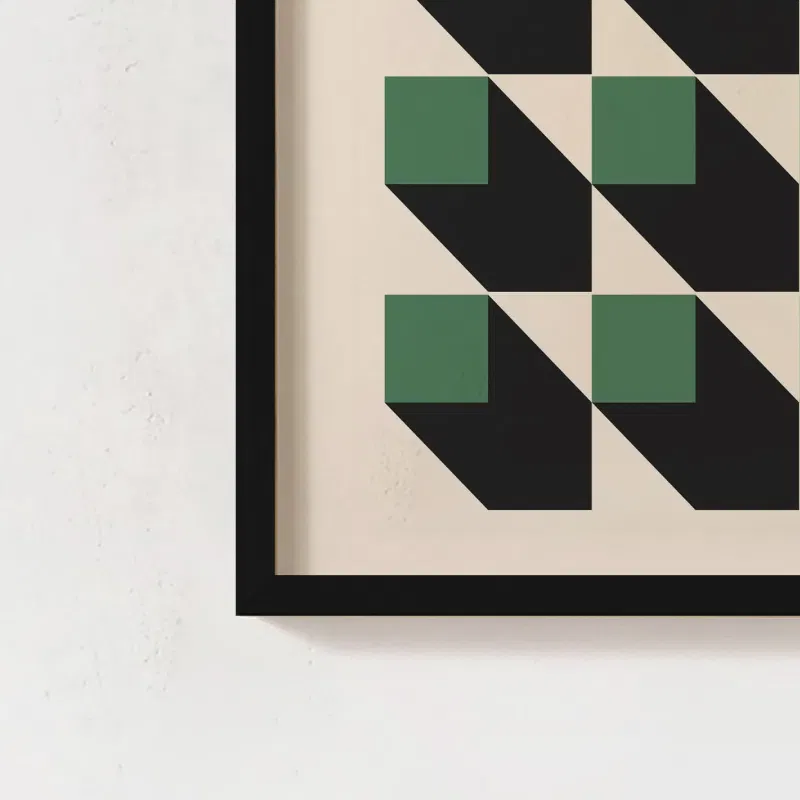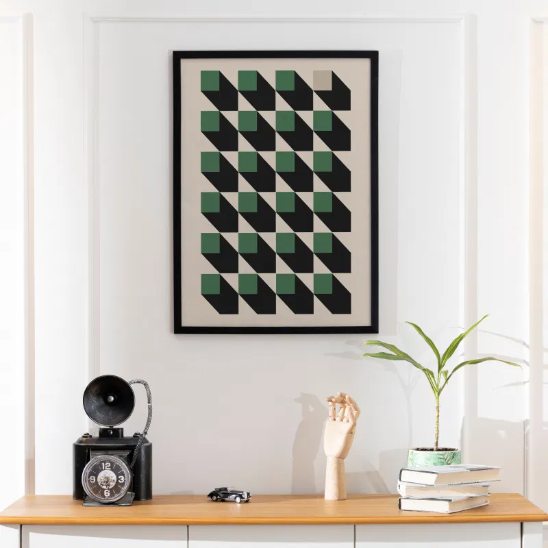Square Pattern là mẫu tranh Bauhaus hình học nổi bật với các khối vuông sắp xếp xen kẽ tạo chiều sâu và hiệu ứng thị giác mạnh mẽ. Tông màu đen – xanh olive giúp không gian thêm điểm nhấn tinh tế, phù hợp với phòng khách, văn phòng hoặc căn hộ phong cách Modern – Minimalist.