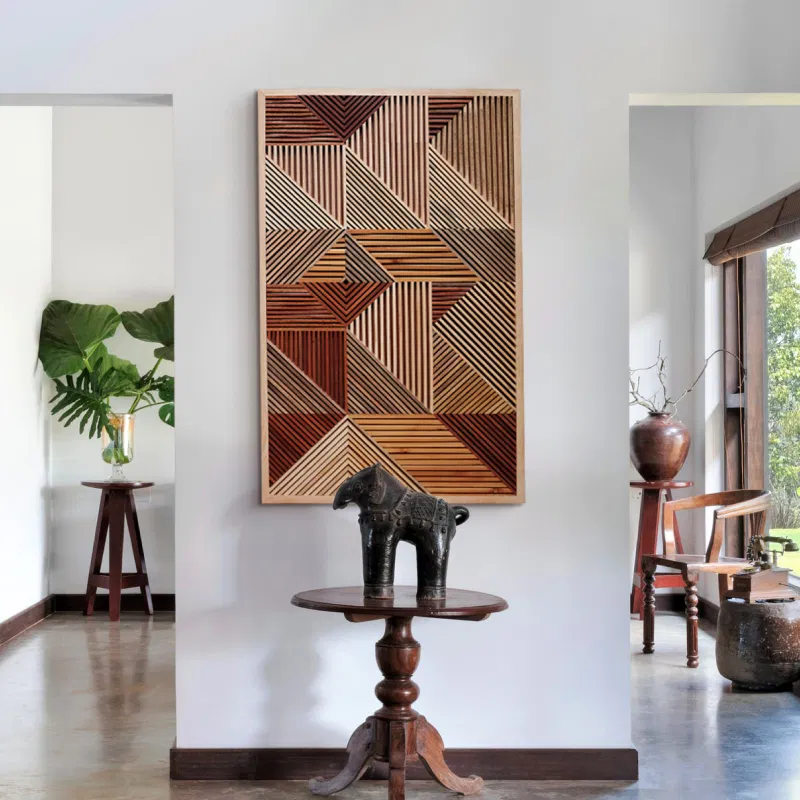 Những thanh gỗ được sắp đặt một cách mỹ thuật. Sử dụng kỹ thuật sơn hoàn thiện sắc sảo. Tạo nên một tác phẩm nghệ thuật treo tường theo phong cách đương đại độc đáo. Tranh sử dụng vật liệu gỗ sồi cao cấp, vân gỗ đẹp. Tranh phù hợp làm điểm nhấn cho mảng tường trung tâm phòng khách. Tranh có thể được treo ở sảnh hoặc các mảng tường hành lang liên kết phòng.