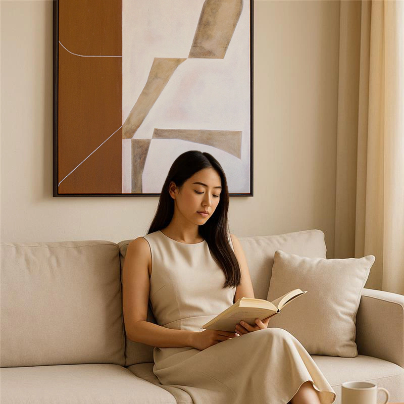 Tranh đương đại hình học  Balance thể hiện bố cục trừu tượng từ khối cong và vuông, pha trộn bảng màu be – nâu – xám hài hòa. Chất liệu acrylic vẽ tay trên canvas, bề mặt có độ sần nhẹ tạo cảm giác thủ công tinh tế. Phù hợp không gian Japandi hiện đại, Scandinavian hoặc Contemporary Warm Tone. Treo cạnh bàn gỗ sáng, ghế linen hoặc tường màu kem sẽ giúp tổng thể trở nên cân bằng và ấm áp.