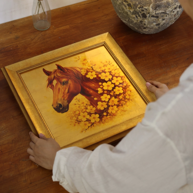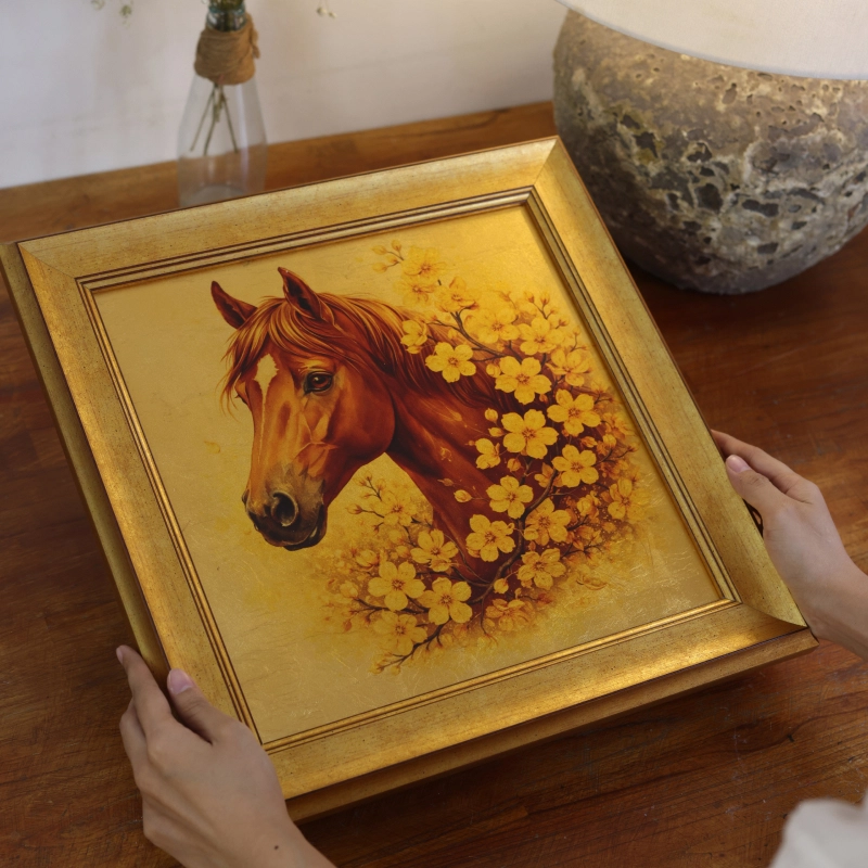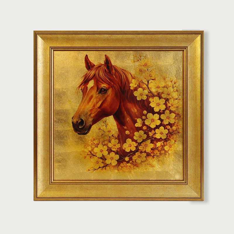 Hình ảnh đầu ngựa kết hợp cùng hoa mai vàng tạo nên tổng thể ấm áp, sang trọng và tràn đầy sức sống. Ánh kim của lớp dát vàng được xử lý tiết chế, hòa quyện với nền sơn mài truyền thống, giúp bức tranh giữ được chiều sâu và vẻ đẹp bền bỉ theo thời gian.