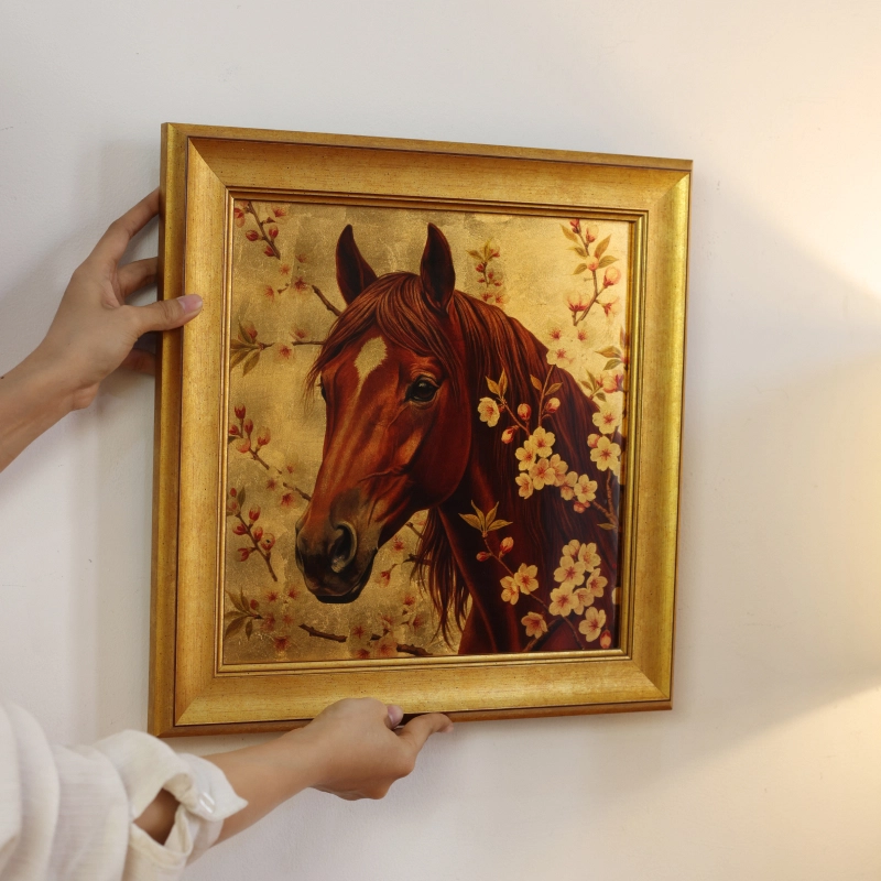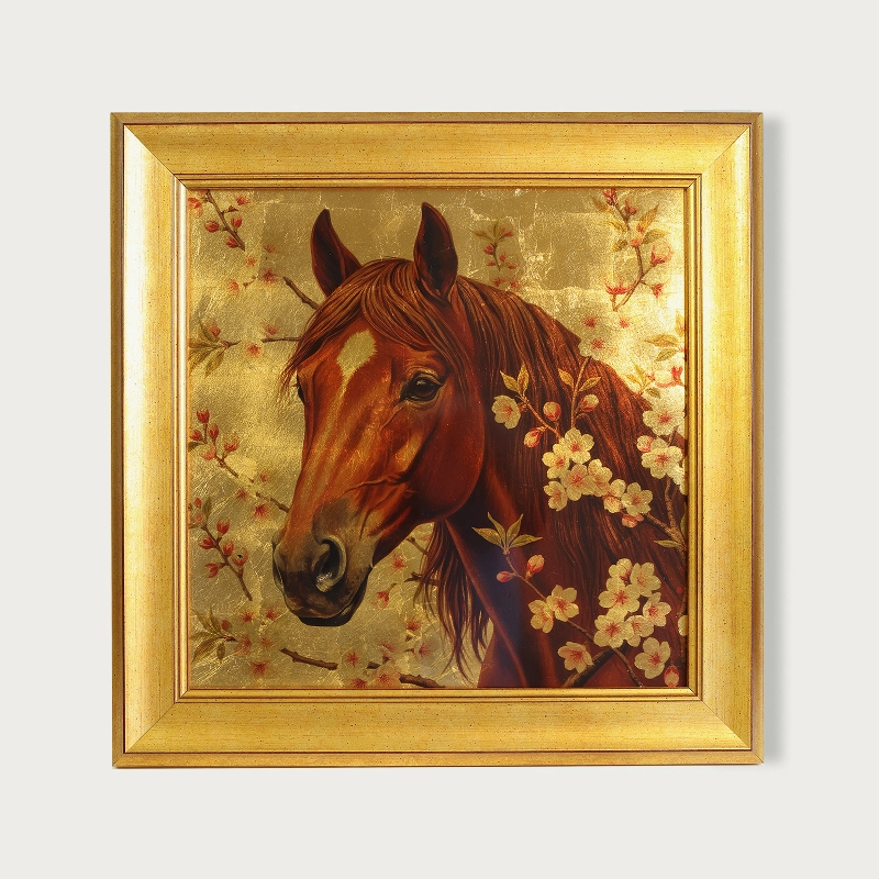 Hình ảnh đầu ngựa nhìn thẳng, được bao quanh bởi sắc hoa đào nở rộ, tạo cảm giác khởi đầu – sinh khí – tươi mới, nhưng vẫn giữ được sự trầm ấm đặc trưng của sơn mài truyền thống.