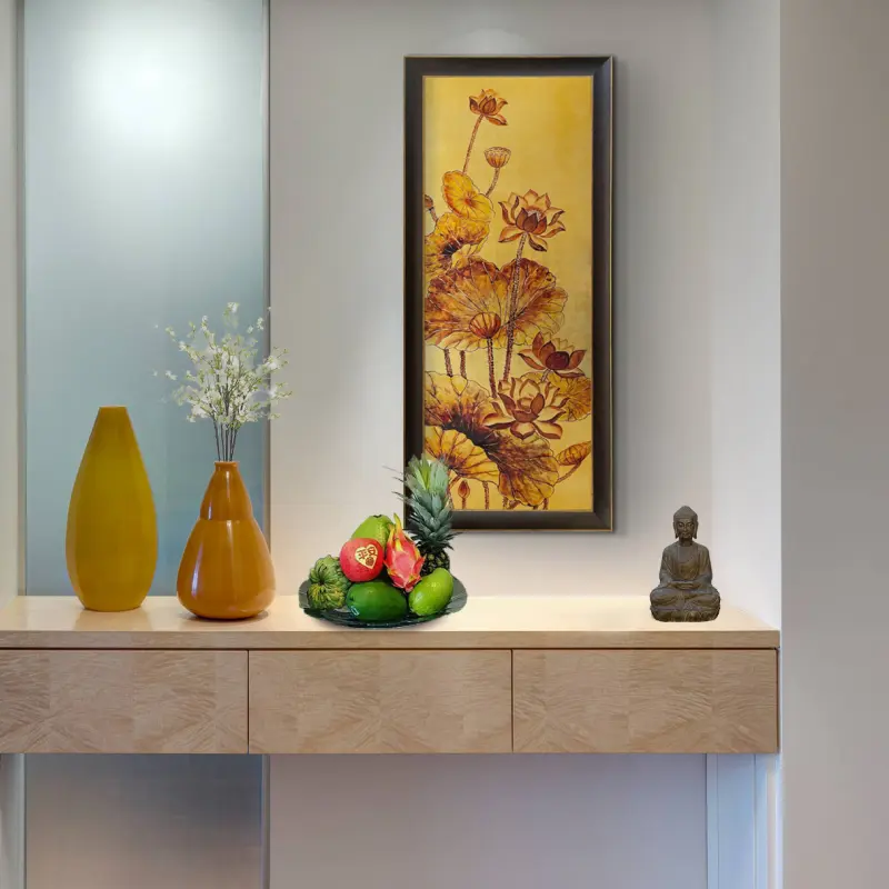 - Bức tranh thể hiện nét đẹp thanh cao của hoa sen nổi bật trên nền tranh được dát vàng thủ công.
