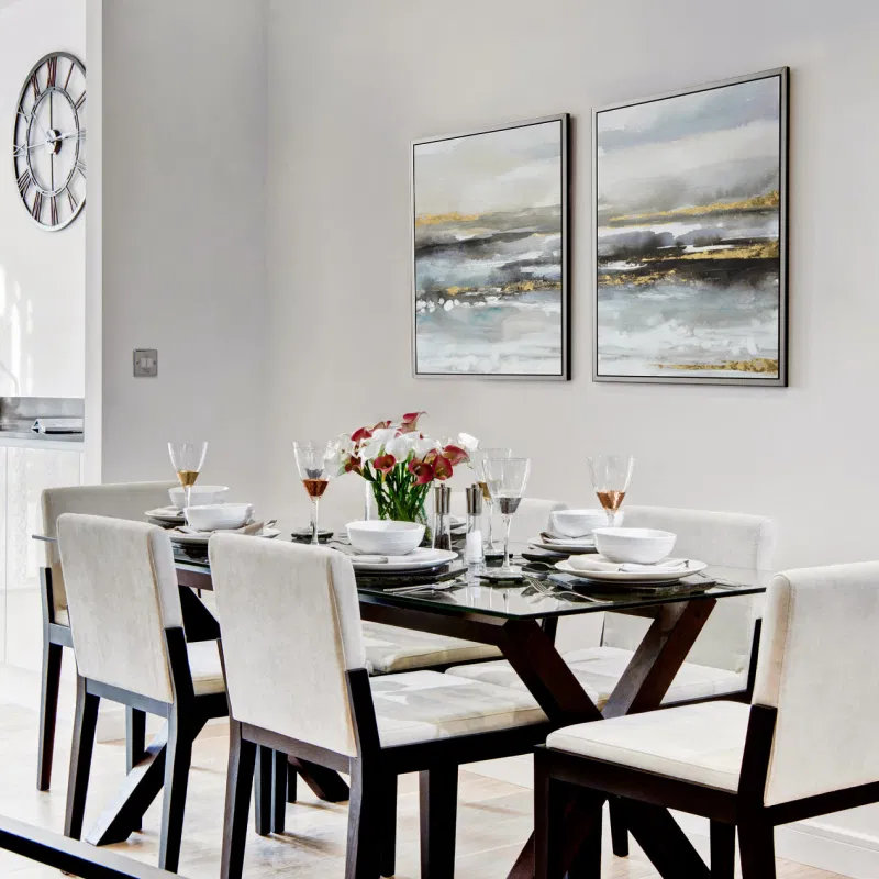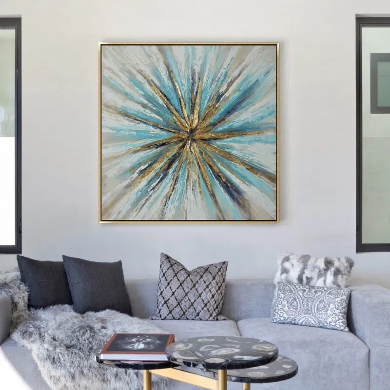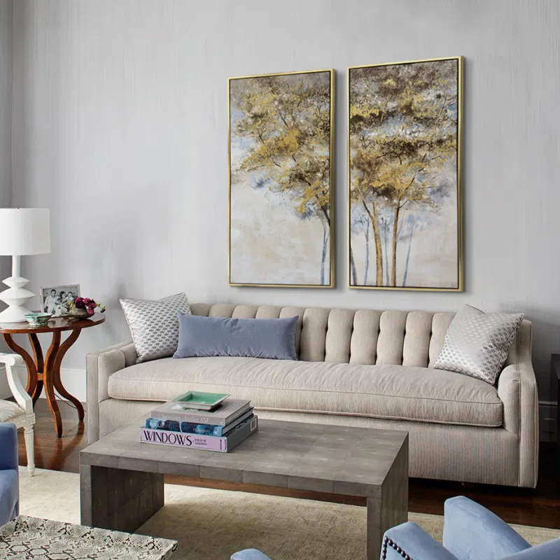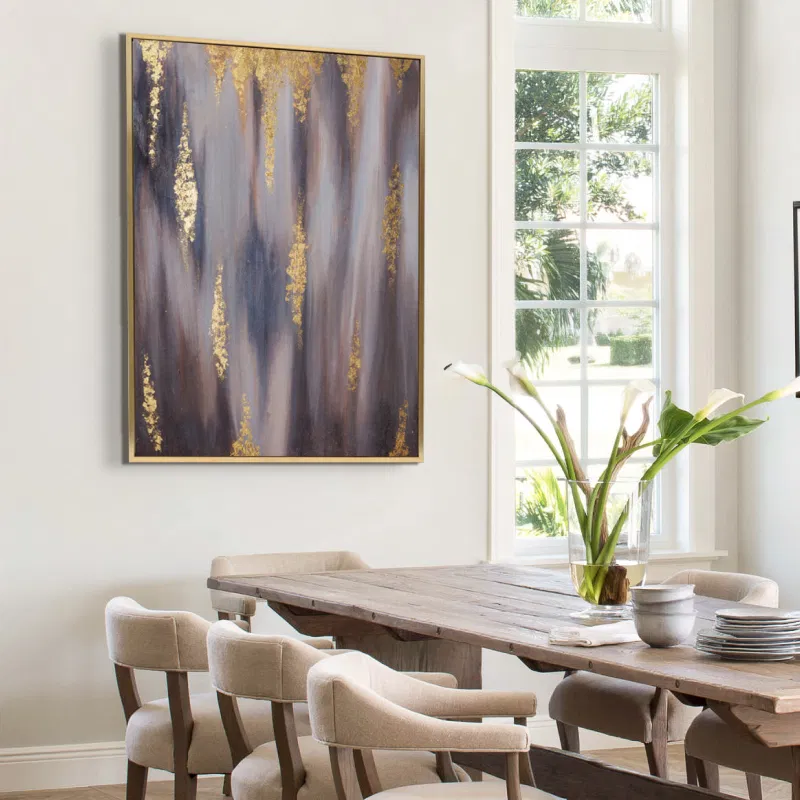- Phòng khách: chọn tranh dát vàng trừu tượng khổ lớn, đặt ở tường trung tâm.