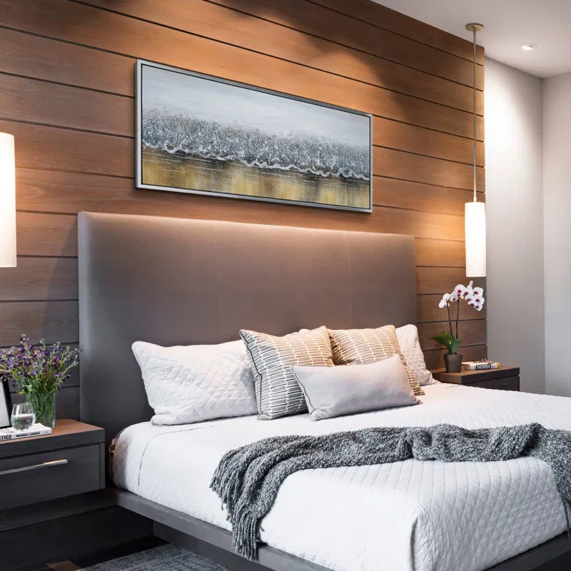 - Phòng ngủ: dùng tranh ánh bạc hoặc resin mềm mại để tạo cảm giác thư giãn.