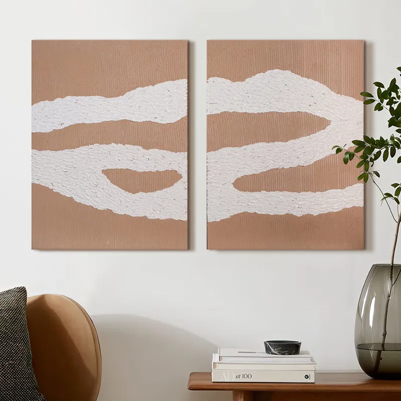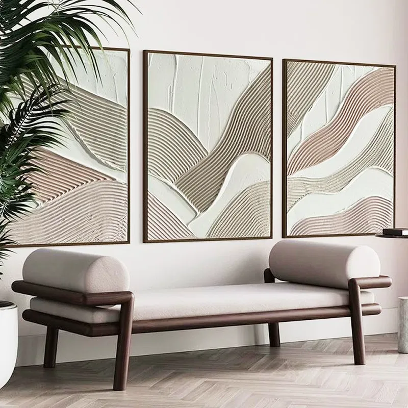 - Contemporary: tranh trắng – be – xám với lớp sơn đắp nổi nhẹ.